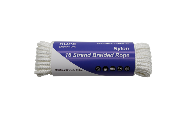 Das weiße Nylonseil mit 6 mm Durchmesser ist im robusten 16-Strang-Diamantgeflecht gefertigt und überzeugt durch Stärke, Elastizität und Abriebfestigkeit. Ideal für Camping, Transport, Bau oder Garten – vom Spannen von Zeltplanen bis zum Sichern von Ladung. Erhältlich in 10- und 25-Meter-Bundles, sofort lieferbar mit schnellem Versand direkt ab Lager in den Niederlanden.