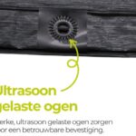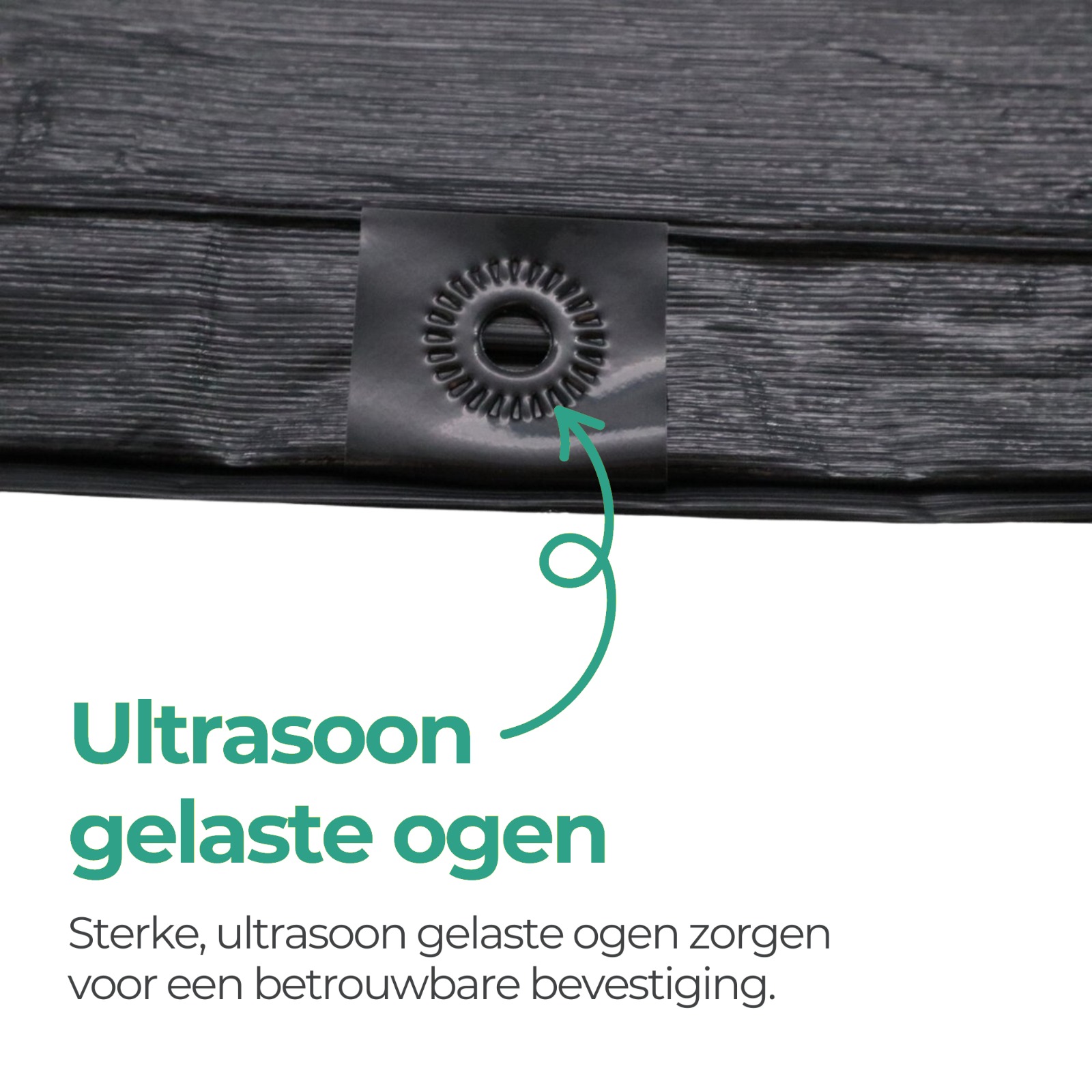 Die ultraschallverschweißten Ösen (ohne Metallringe) bieten eine stabile Befestigung rundum im Abstand von ca. 100 cm. Erhältlich ausschließlich in schwarz dezent, ordentlich und unauffällig.