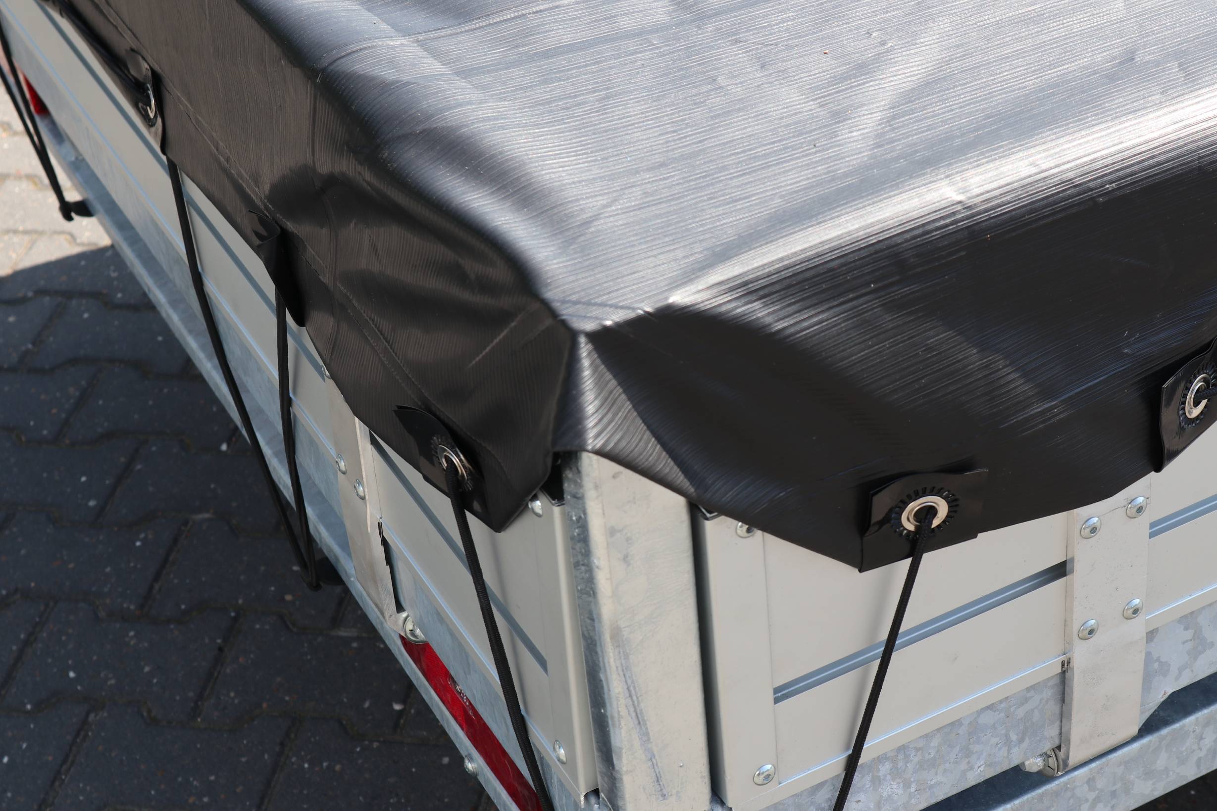 Alle Xstrong Anhänger-Abdeckplanen werden ohne Zubehör geliefert. Für eine sichere Befestigung empfehlen wir elastisches Kordel in mindestens Umfang-Länge der Plane; rundum durch alle Ösen führen und straffziehen. So sitzt die Plane auch bei Wind und häufigem Einsatz sicher.